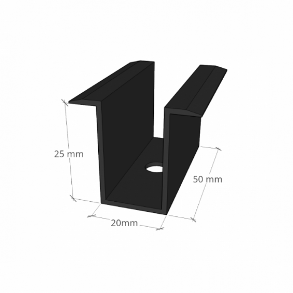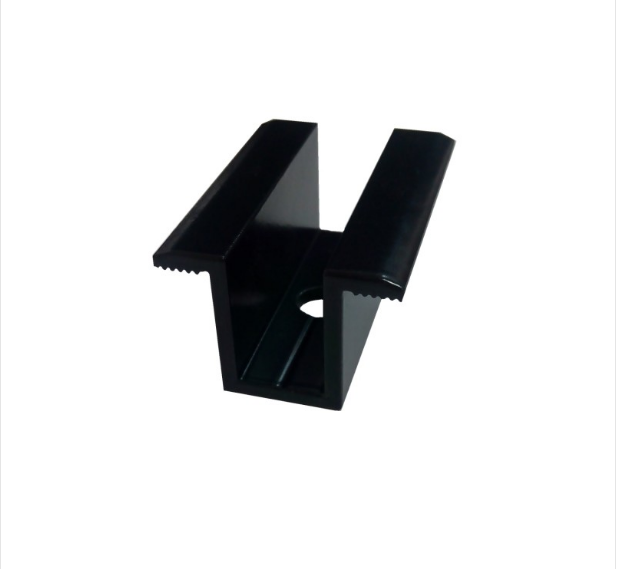 Fibbia centrale, nera, alluminio. Utilizzato per il montaggio di moduli fotovoltaici con uno spessore del telaio di 35, 40, 45 e 50 mm sui profili di montaggio. Il morsetto viene fissato tra i pannelli fotovoltaici con bullone inox e dado quadro M8.