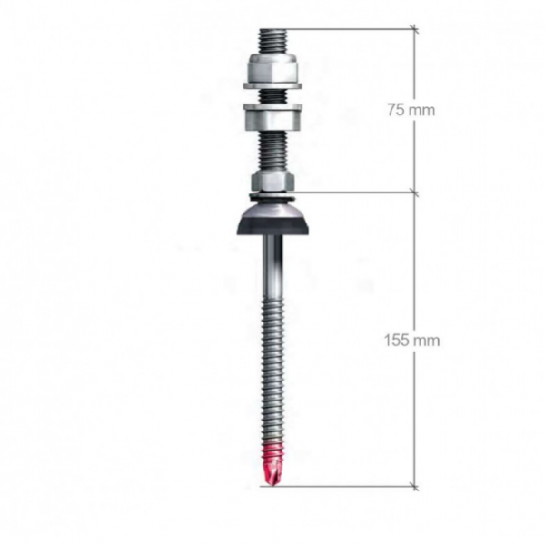 Il bullone a doppia filettatura M8X155/M10X70 è realizzato in acciaio inox e serve per il fissaggio diretto degli impianti fotovoltaici alla sottostruttura in acciaio. Il connettore solare EJOT è il primo connettore in acciaio inossidabile approvato dall'Istituto tedesco per la tecnologia degli edifici (Dibt) che può essere utilizzato per il montaggio di impianti fotovoltaici su tetti in lamiera trapezoidale o pannelli sandwich. Il nuovo connettore è realizzato in acciaio inossidabile A2 (AISI 304) o A4 (AISI 316) e ha una punta di perforazione in acciaio temprato, quindi non è necessario eseguire una preforatura in sottostrutture sottili in acciaio fino a 3 mm di spessore. Ciò consente di forare e fissare in un'unica fase di lavoro. Lunghezza totale della vite: 225 mm