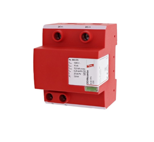 Lo scaricatore di sovratensione DEHN Combo 1200 V tipo 1+2 (varistore) è uno scaricatore di sovratensione combinato bipolare per l'uso universale in impianti fotovoltaici con e senza messa a terra fino a 1200 V DC.