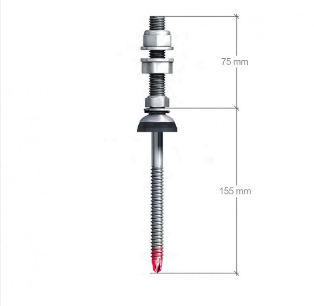 Il bullone a doppia filettatura M8X155/M10X70 è realizzato in acciaio inox e serve per il fissaggio diretto degli impianti fotovoltaici alla sottostruttura in acciaio. Il connettore solare EJOT è il primo connettore in acciaio inossidabile approvato dall'Istituto tedesco per la tecnologia degli edifici (Dibt) che può essere utilizzato per il montaggio di impianti fotovoltaici su tetti in lamiera trapezoidale o pannelli sandwich. Il nuovo connettore è realizzato in acciaio inossidabile A2 (AISI 304) o A4 (AISI 316) e ha una punta di perforazione in acciaio temprato, quindi non è necessario eseguire una preforatura in sottostrutture sottili in acciaio fino a 3 mm di spessore. Ciò consente di forare e fissare in un'unica fase di lavoro. Lunghezza totale della vite: 225 mm