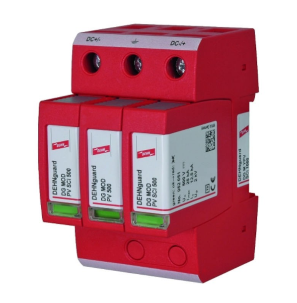 Il DEHNguard M YPV SCI 1000 è uno scaricatore di sovratensione multipolare modulare con un dispositivo di commutazione DC a tre stadi per l'impiego in impianti fotovoltaici.